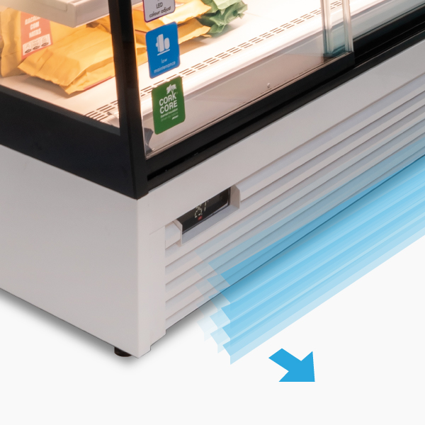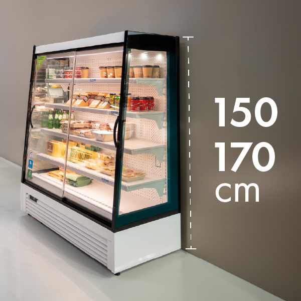 Portas frontais deslizantes para maior poupança de energia e visibilidade perfeita dos produtos. Cortina noturna (opcional) para modelos abertos.