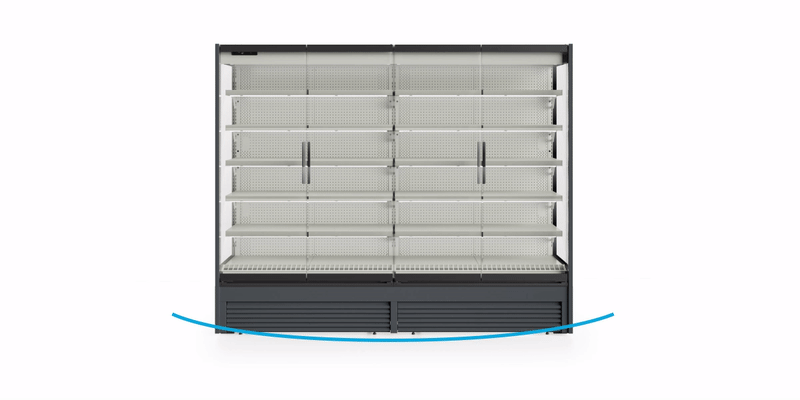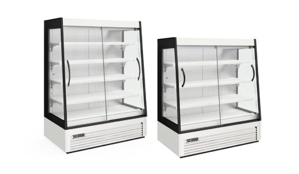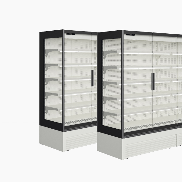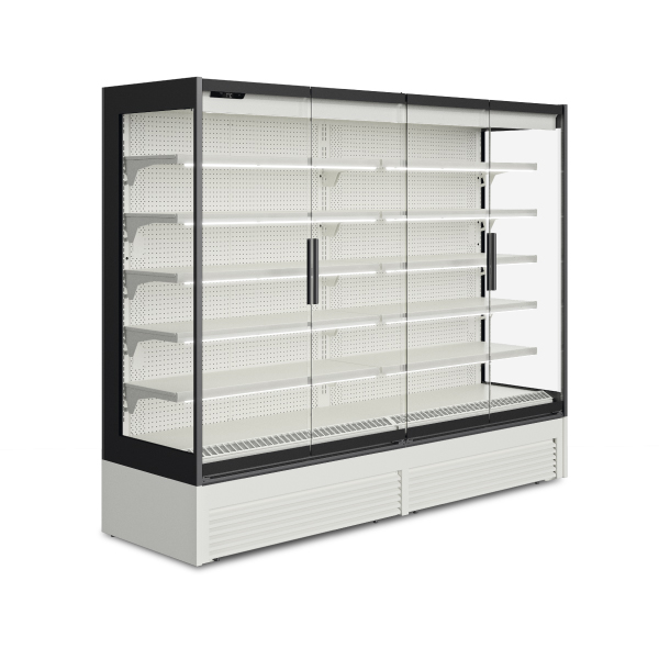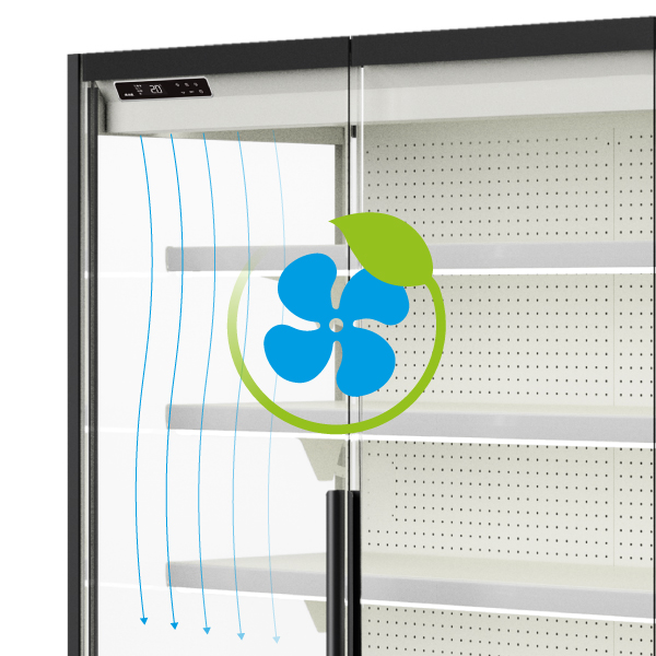 O sistema de refrigeração ventilado de velocidade variável, com cortina de ar otimizada, reduz a entrada de calor e garante uma temperatura uniforme em todo o expositor. Os modelos para congelados possuem portas em vidro triplo, enquanto os refrigerados oferecem opções com portas frontais em vidro duplo ou cortina noturna (modelos 3M2 e 3H1).