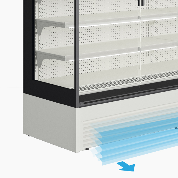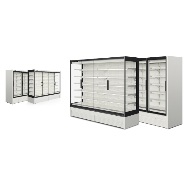 O sistema de refrigeração ventilado de velocidade variável, com cortina de ar otimizada, reduz a entrada de calor e garante uma temperatura uniforme em todo o expositor. Os modelos para congelados possuem portas em vidro triplo, enquanto os refrigerados oferecem opções com portas frontais em vidro duplo ou cortina noturna (modelos 3M2 e 3H1).